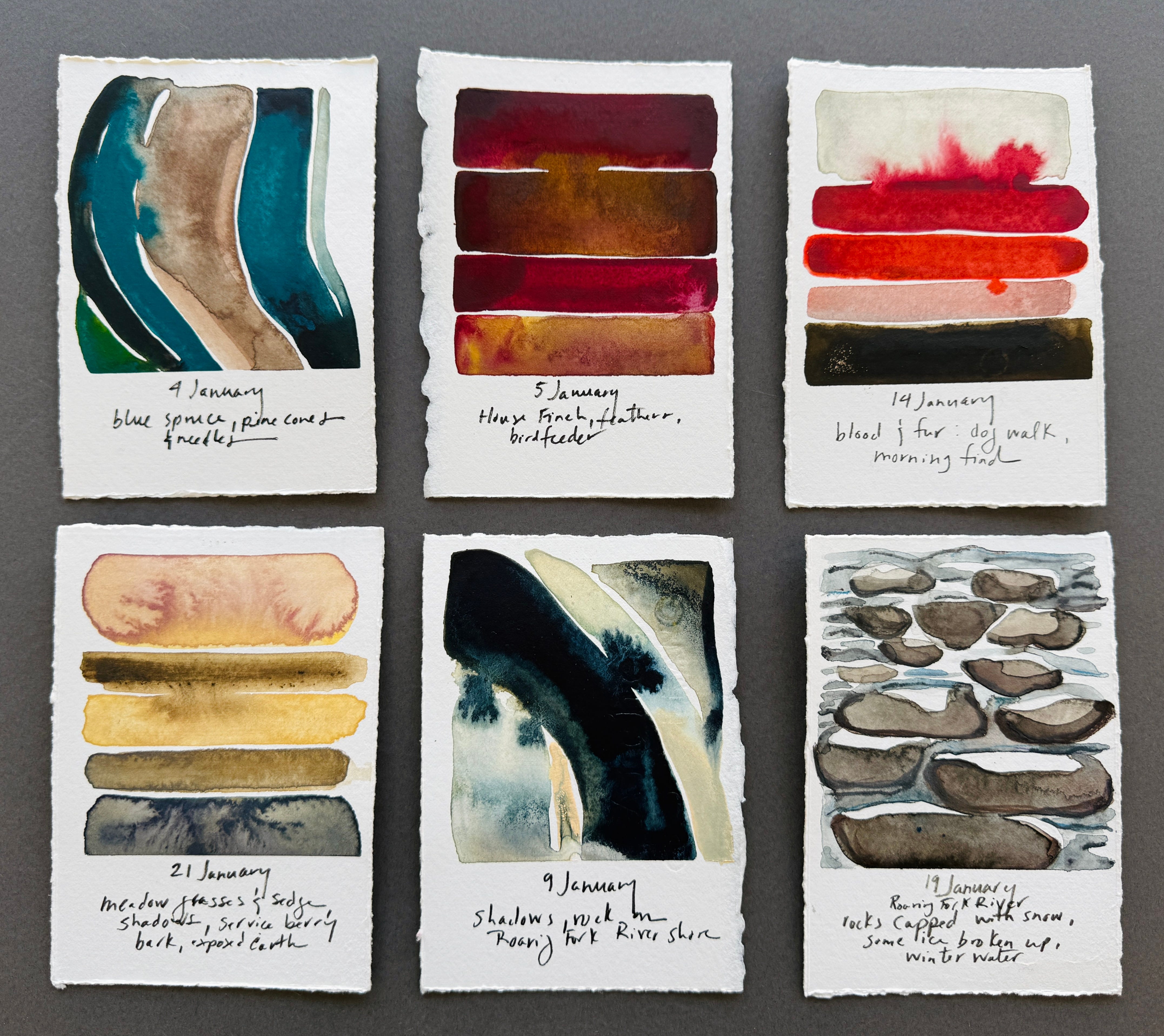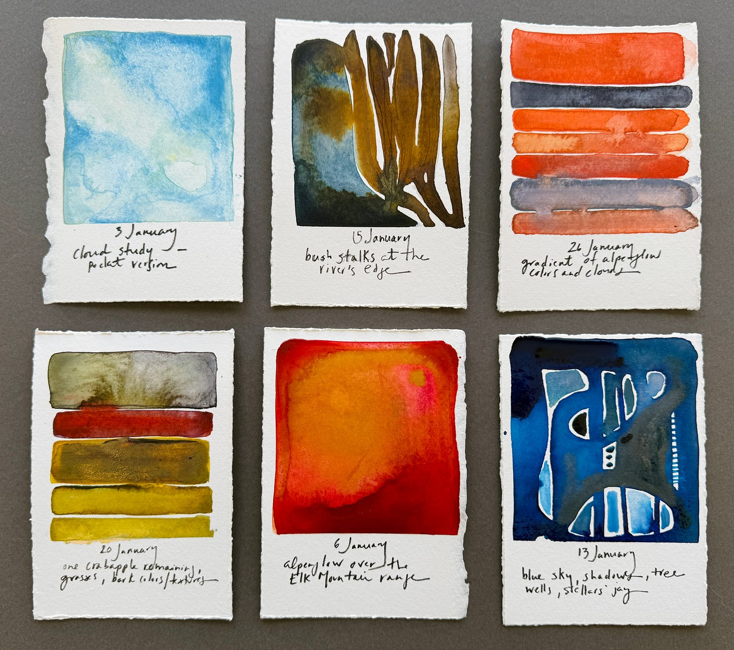 I have been making quick, daily notations of color, watching the tempo and tenor of light shift with longer days, looking for patterns while noting a few key details in pen — all an homage to my native Colorado. Down the line, I plan on making these into artist books. Does making a visual register of the wild places around me have an immediate impact on this nation, as the norms and laws that bind and govern no longer apply? Will these protect from terror or reverse evil? No, not at all. But meditating over the details of place reorients and inspires me, like that red dot on a train station map that says: you are here, and now you can see how you get to there. A pause, then a way forward.